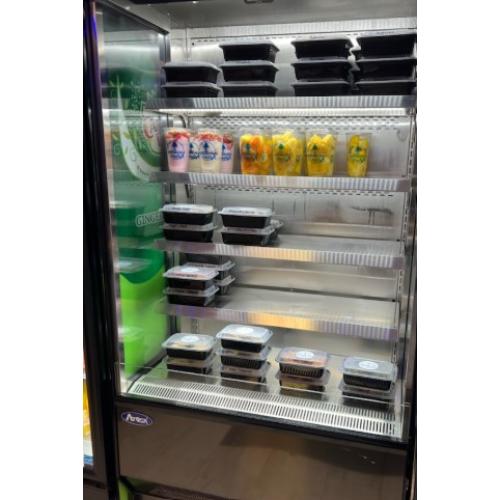 Open Air Merchandiser, 39-3/5"W x 28"D x 78-7/10"H, 14.4 cubic capacity, (4) shelves, full electronic controller, LED lighted header panel, LED lighting per shelf and interior top, pull down night curtain, stainless steel interior, black exterior, 4" casters, R-290 natural refrigerant.
